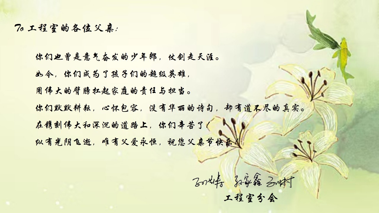 父亲的字典总是写满坚强,流着情长,没有华丽的诗句,却有道不尽的真实。在第112个父亲节来临之际,好博网页版_好博(中国)工程室分会举办“默默‘父’出致敬父爱”父亲节活动,为分会内辛勤耕耘的父亲们准备了节日的贺卡,送去了温馨的祝福。纵有光阴飞逝,唯有父爱永恒,向每一位伟大而深沉的工程父亲致敬!