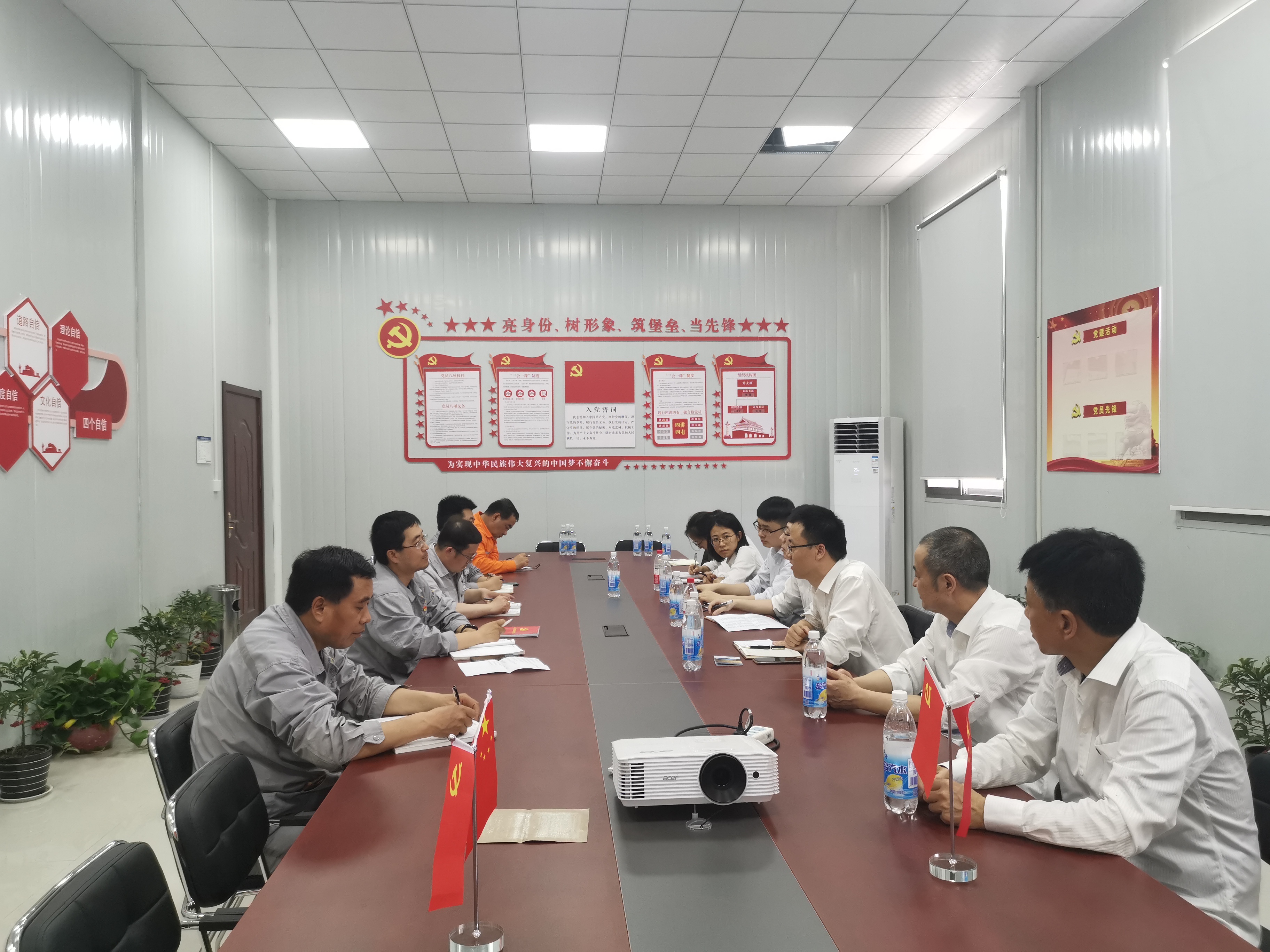 上午,项目经理、项目党支部书记聂磊首先对现场基础设施建设、工程信息化把控、项目党支部筹建等情况进行了汇报。随后,双方逐一对项目现场党建及生产中的要点、难点问题展开沟通交流。会议指出党建工作需立足于现场,切实做好“党建与生产相融合”,开展特色化党建活动,并继续加强项目团队建设。会议还明确了项目党支部工作流程及三会一课重点内容,协调配备了项目紧缺的安全、土建工程师等岗位人员。中午,大家参观了项目驻地,并了解了项目员工的生活情况。